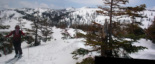 途中、1710m峰尾根へのシュプールに危うく引き込まれるところでした。ルートをよく選べば滑り降りれないことはないとは思いますが。